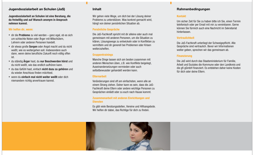 Die Jugendsozialarbeit an Schulen (JaS) ist ein Beratungs- und Unterstützungsangebot auf Grundlage von § 13 SGB VIII für Schüler, Lehrkräfte und auch für die Eltern. Sie dient als Schnittstelle zwischen der Jugendhilfe, den Familien und der Schule.